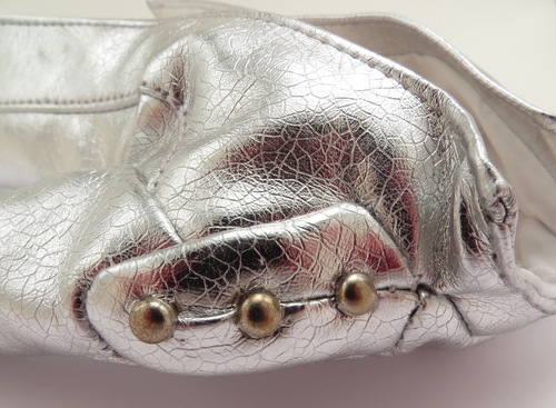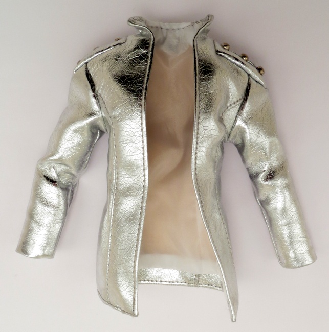 Silver jacket: Reptile textured silver jacket, studded epaulettes, lined with white satin, tagged on seam. |
