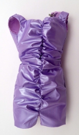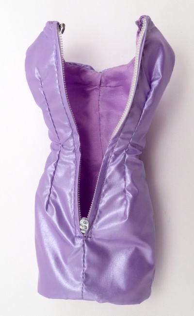 Mini Dress: very fine, shiny polyester weave (like Classic Jem's dress) ruched mini tank dress, zipper closure and one hook and eye closure in back. Lined with lilac satin, tagged on seam. |