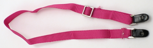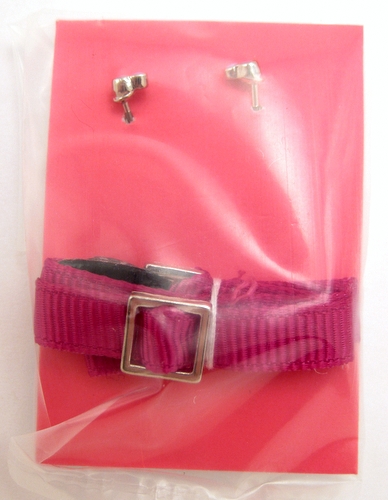 Guitar strap: magenta ribbon with silver buckle, faux leather fasteners on ends. It came attached to a pink piece of cardboard with the earrings in a little baggie. |