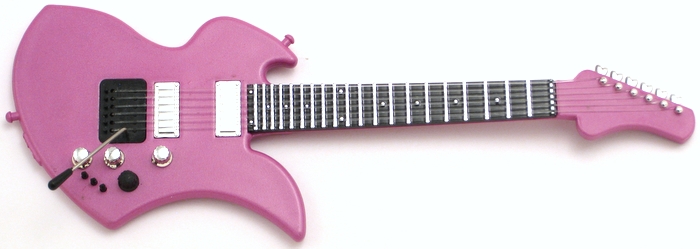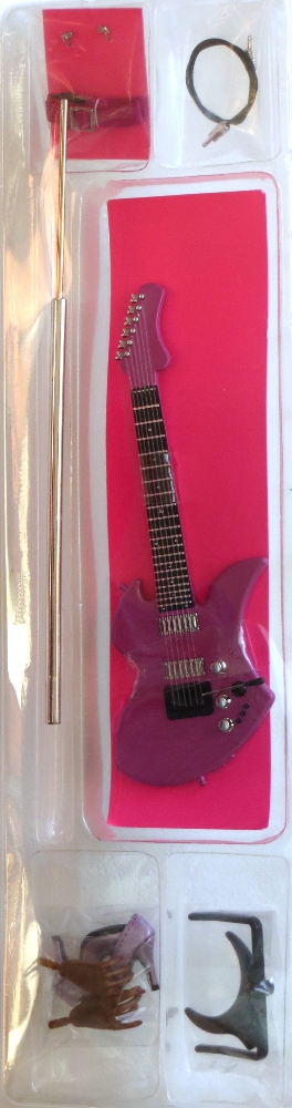 ![]() | Guitar: Has real strings and whammy bar -not functional of course but still looks great. Comes attached with soft vinyl clear straps to apink piece of cardboard in the accessories tray. |
