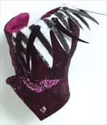 Top: microsuede top with magenta foil pattern, lined with magenta satin, tagged, metal "stud" at navel. Attached 'bib' is a faux zebra hair pattern with black mylar claws attached. Hook and eye closure in the back. |