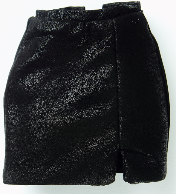 Miniskirt: Soft black leatherette, lined in satin, has a slit up the front, hook and eye closure in back. |