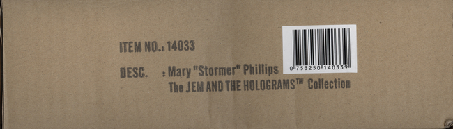Shipper: A plain cardboard box with some printing on the bottom reading ITEM NO.: 14033 /DESC.: Mary "Stormer" Phillips//The JEM AND THE HOLOGRAMSTM Collection. The doll box was wrapped in clear cellophane bag. |