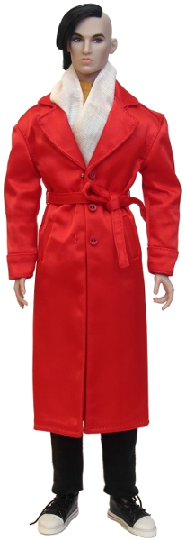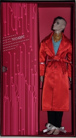 The box cover lifted off to reveal the doll inside - he is tied in with white ribbons. The knees are protected/held in place with clear vinyl. To the left of the doll is a thin cardboard "door" with the doll's name on it, which opens to reveal the accessories tray. The computer parts and extra head are mounted directly onto the cardboard backing (not really 'in' the tray in the same way as other Integrity dolls). Other parts are in plastic baggies in the tray. The stand base is behind calves in a separate compartment. Behind the inner tray that holds both the doll and "locker" part is where the COA and instructions can be found. |
