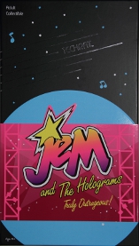 The inside of the top cover is maroon with a hot pink Jem logo, music notes and confetti. The inner part of the back of the box is undecorated black. The doll display area is the same maroon with a circuit board pattern in hot pink decorating the "door". |