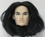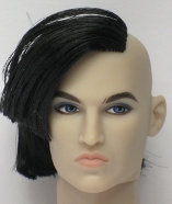 completely bald on left third of his skull, steel grey/blue eyes, with