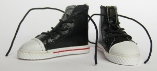 shoes: Sneakers; faux leather black "Chuck Taylor" style high stop sneakers with black laces, white soles. |