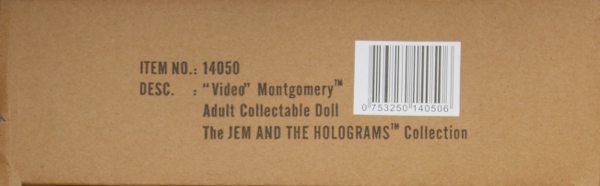Shipper: A plain cardboard box with some printing on the bottom reading ITEM NO.: 14050/DESC.: "Video Montgomery"TM/Adult Collectable doll/The JEM AND THE HOLOGRAMSTM Collection. The doll box was wrapped in clear cellophane bag. |