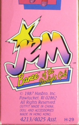 ![]() | ![]() | US Issue, © 1987 Hasbro, Inc./Pawtucket, RI 02862/All Rights Reserved./OUTFIT MADE IN CHINA./DOLL AND ACCESSORIES/MADE IN HONG KONG./4213/4025 Asst. H-29 |
