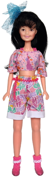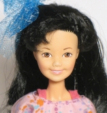 11" doll: Caucasian - technically she's Vietnamese but there is no difference in skin tone at all- with long silky black hair. These are the least recognizable Jem dolls as they are proportioned like teenagers, plus their arms don't bend, flat feet, wrists don't swivel. |