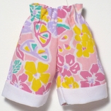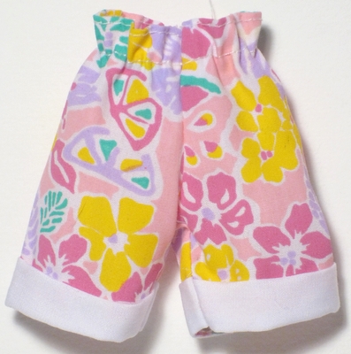 cotton, Bermuda length, rolled at cuffs, elasticized cinch waist, floral pattern.