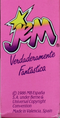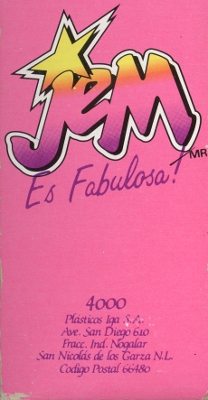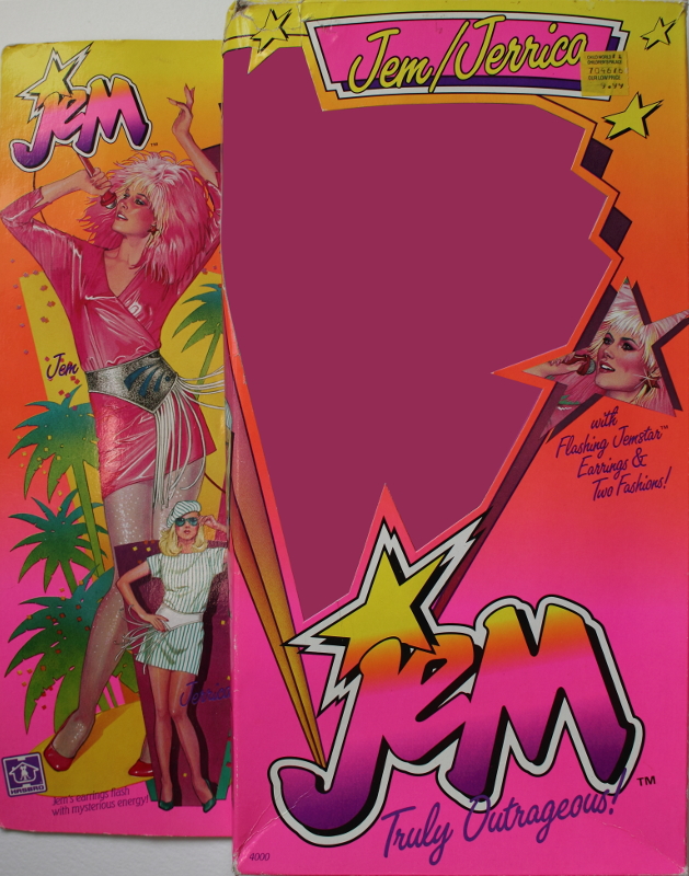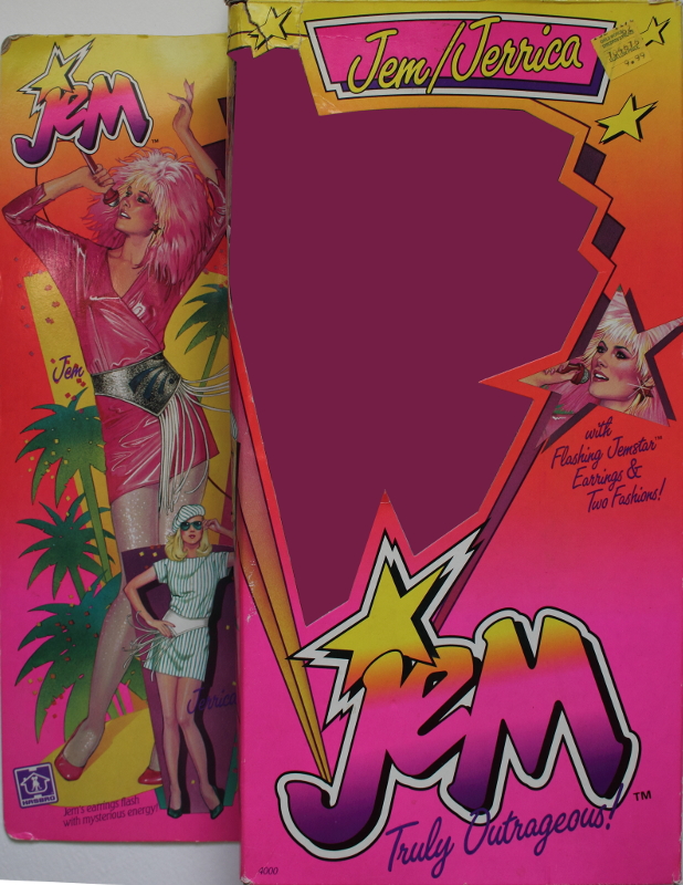 Box: First year Jem/Jerrica box with side flap, US version, 4000/© 1985 Hasbro, Inc./Pawtucket, RI 02862/All Rights Reserved/Assembled in China/Packed in Hong Kong/H22 (no name on side/top and bottom flaps) |