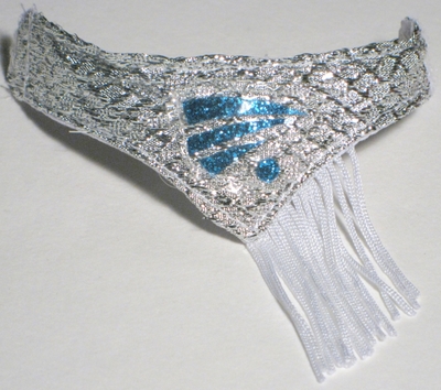 bracelet: silver plastic cuff bracelet, has a jagged edge but not a zig-zag pattern