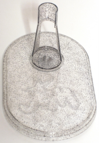 figure stand ; Clear with tiny black speckles throughout. The Jem logo is embossed on the underside.