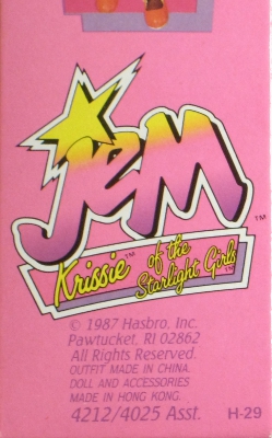 ![]() | ![]() | US Issue, © 1987 Hasbro, Inc./Pawtucket, RI 02862/All Rights Reserved./OUTFIT MADE IN CHINA./DOLL AND ACCESSORIES/MADE IN HONG KONG./4212/4025 Asst. H-29 |