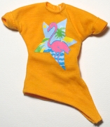 sweatshirt: soft cotton, orange short sleeved shirt with flamingo decal, velcros in back. The bottom ties up, it's shown untied. |