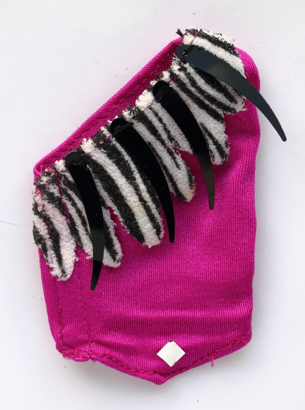 zebra print. Sewn to her shirt are four black mylar "claws"